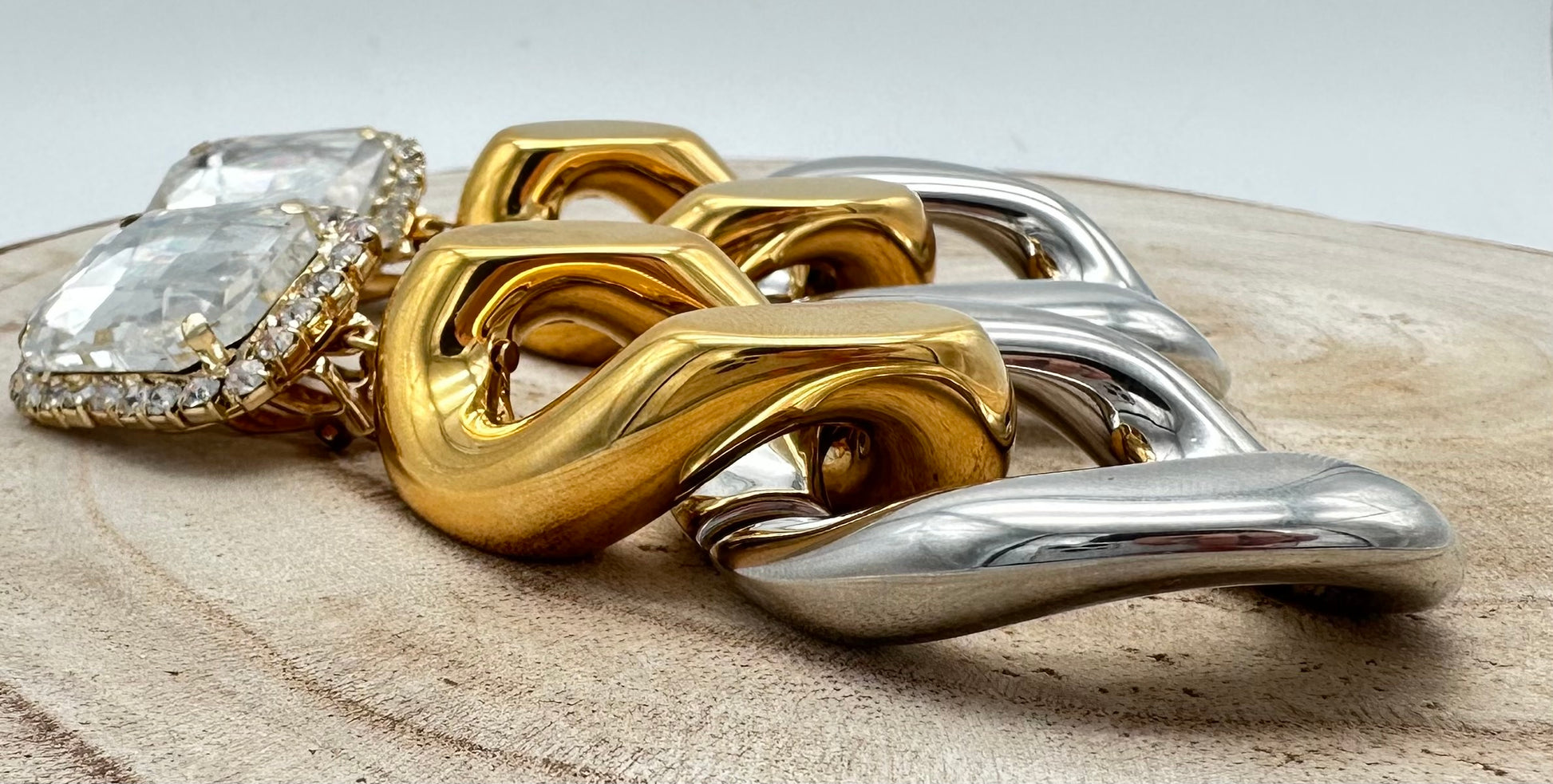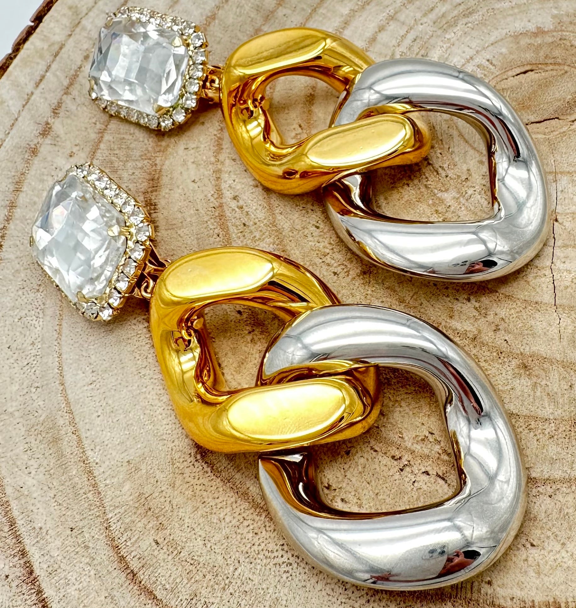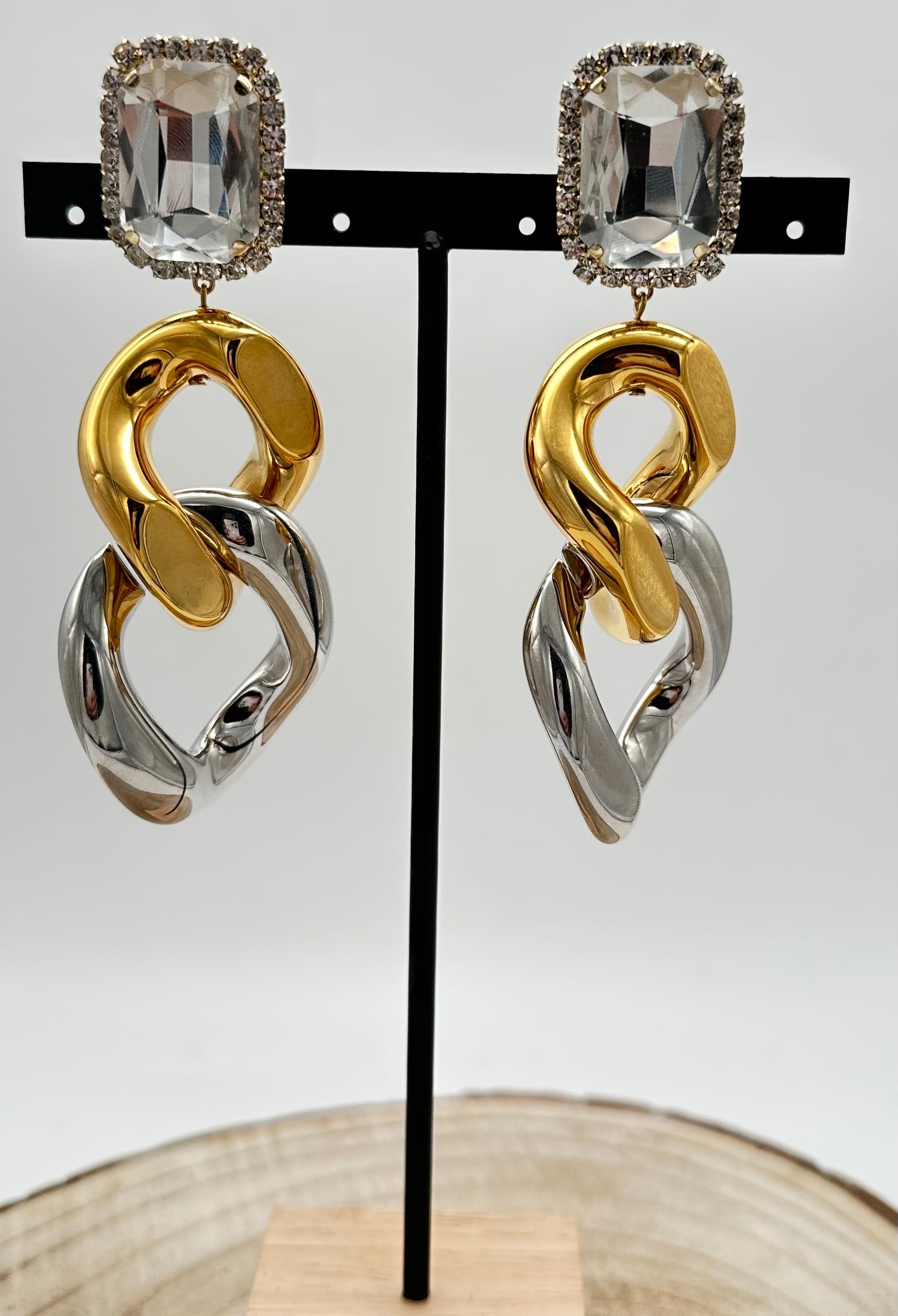 Boucle d’oreille en maille doré et argenté composée d’un cabochon en cristal - Francine BRAMLI