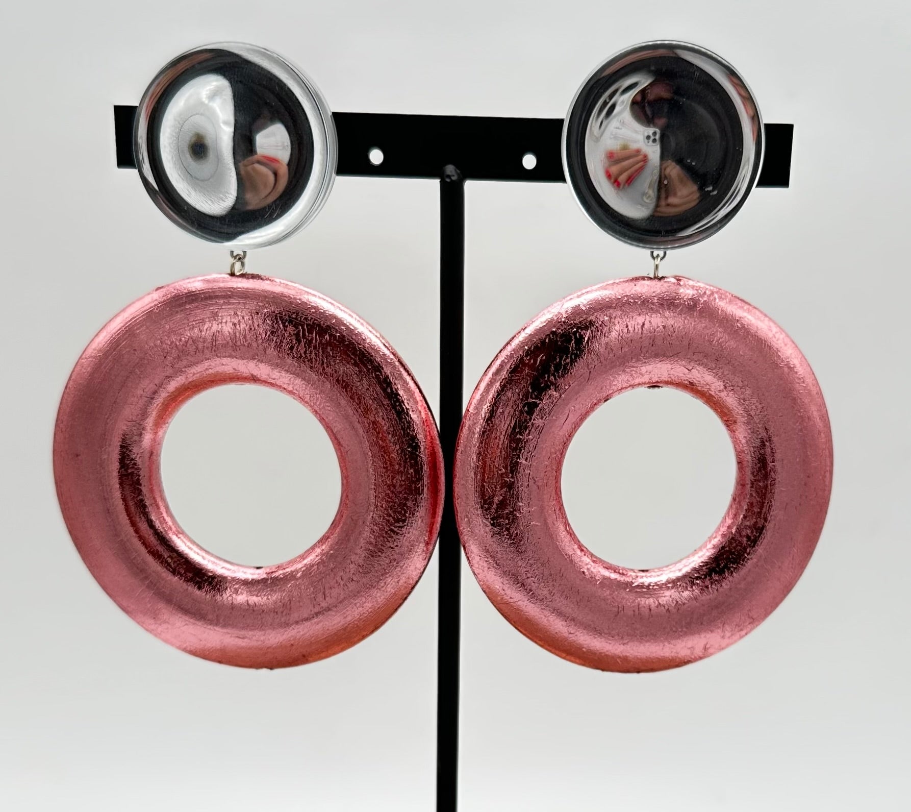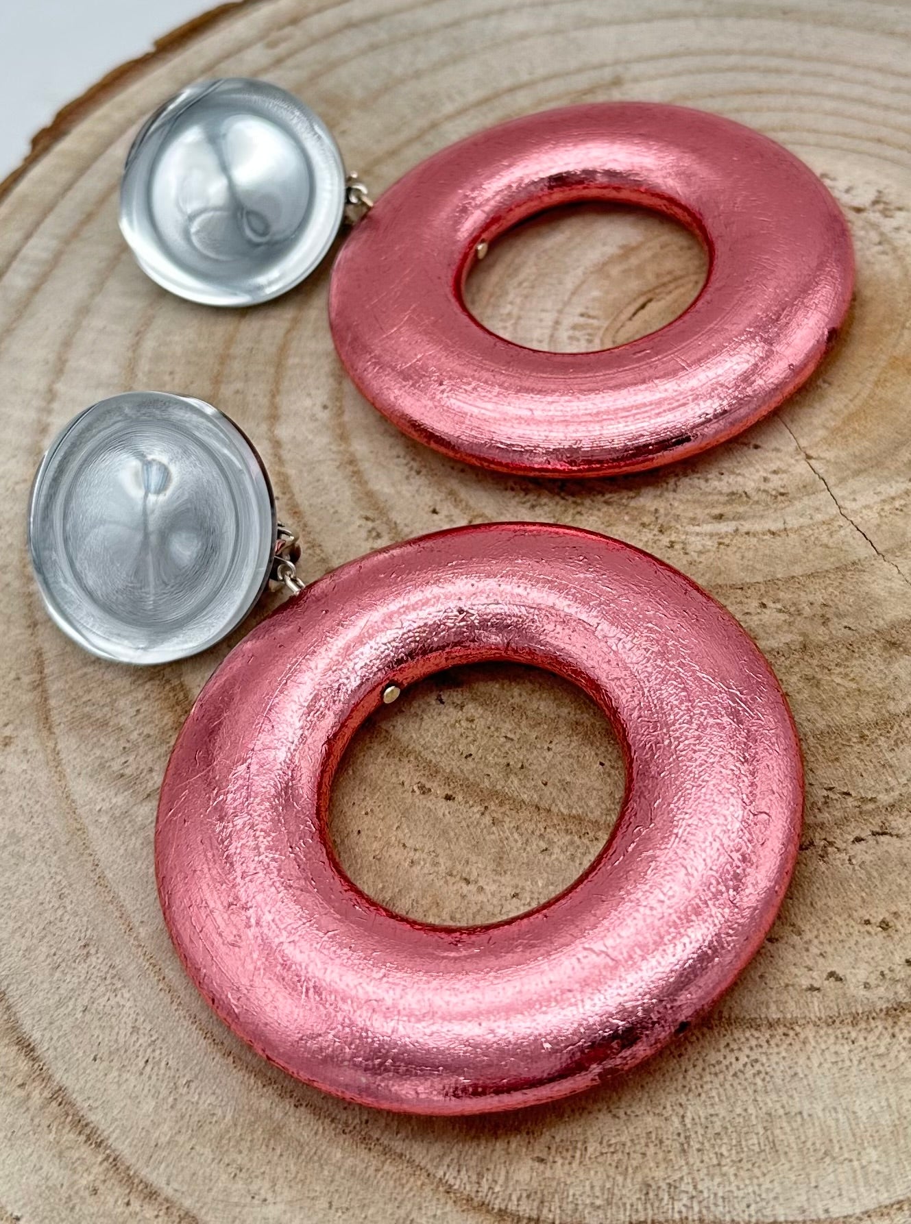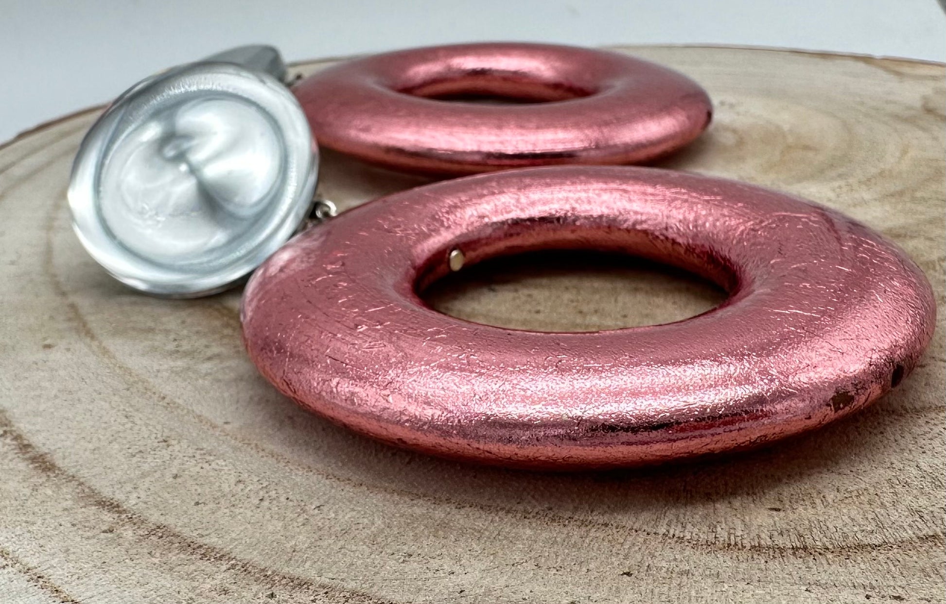 Boucle d’oreille , perle en bois recouverte de feuilles d’argent Teintees rose - Francine BRAMLI