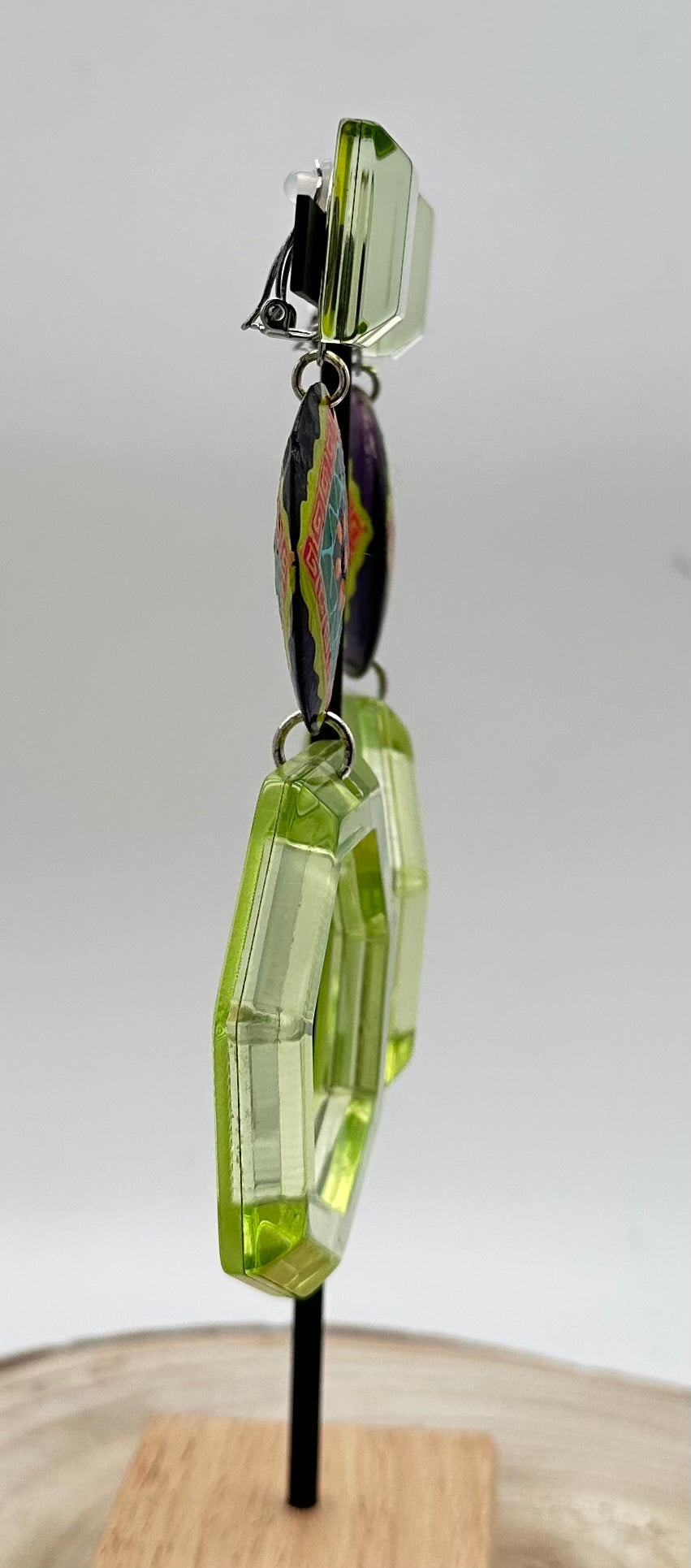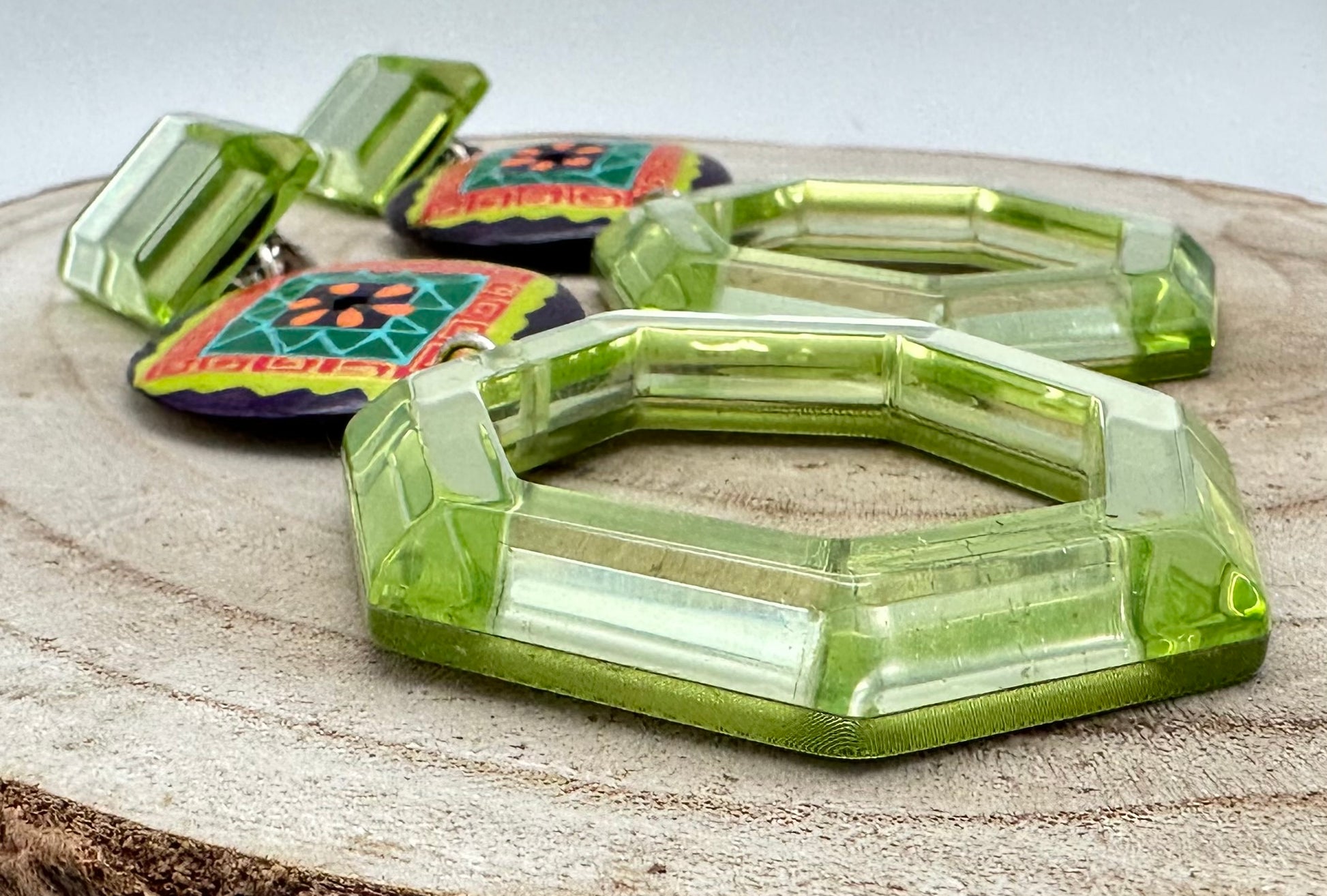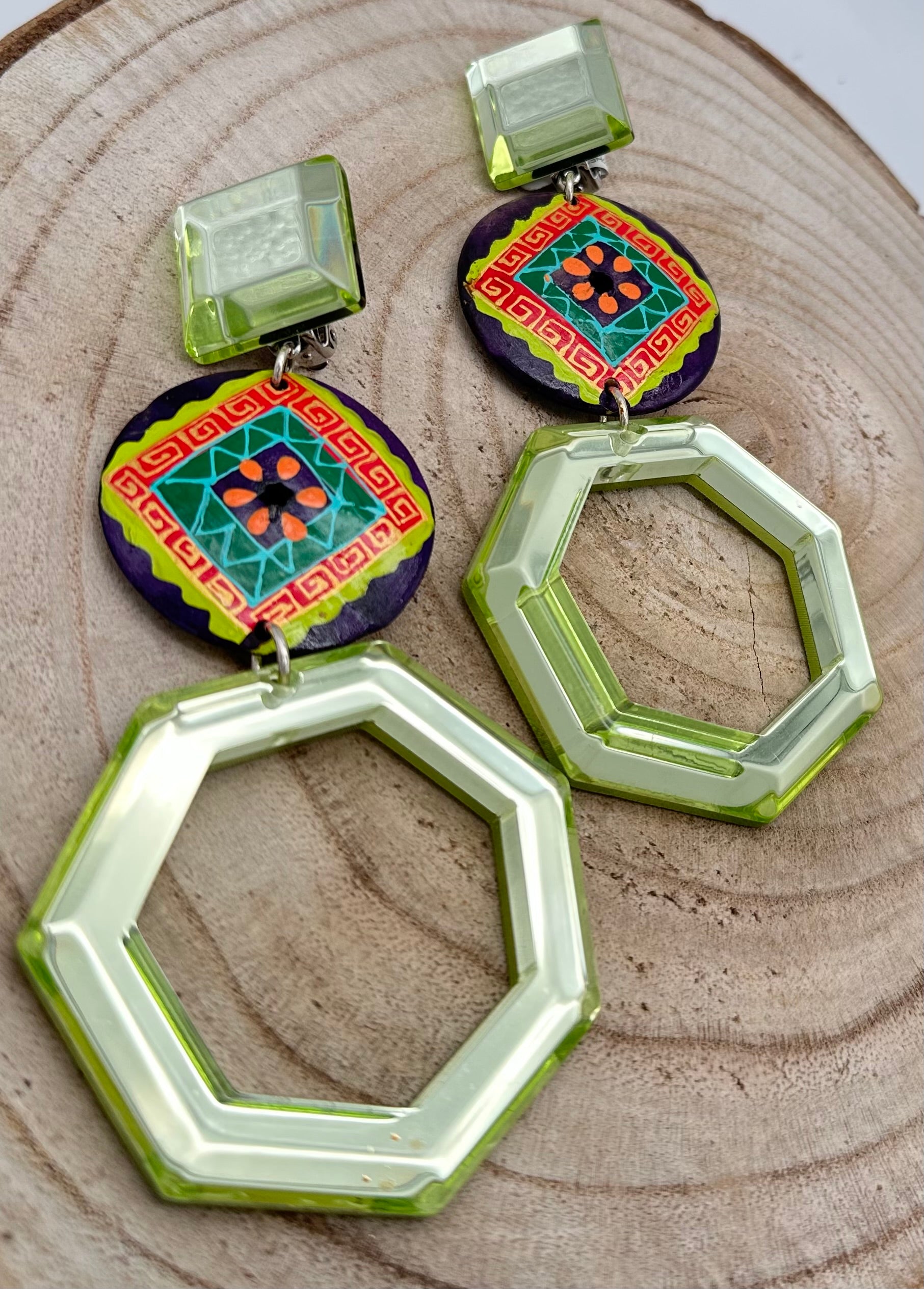 Boucle d’oreille Miroir verte , perle bois peinte et créole hexagonale - Francine BRAMLI
