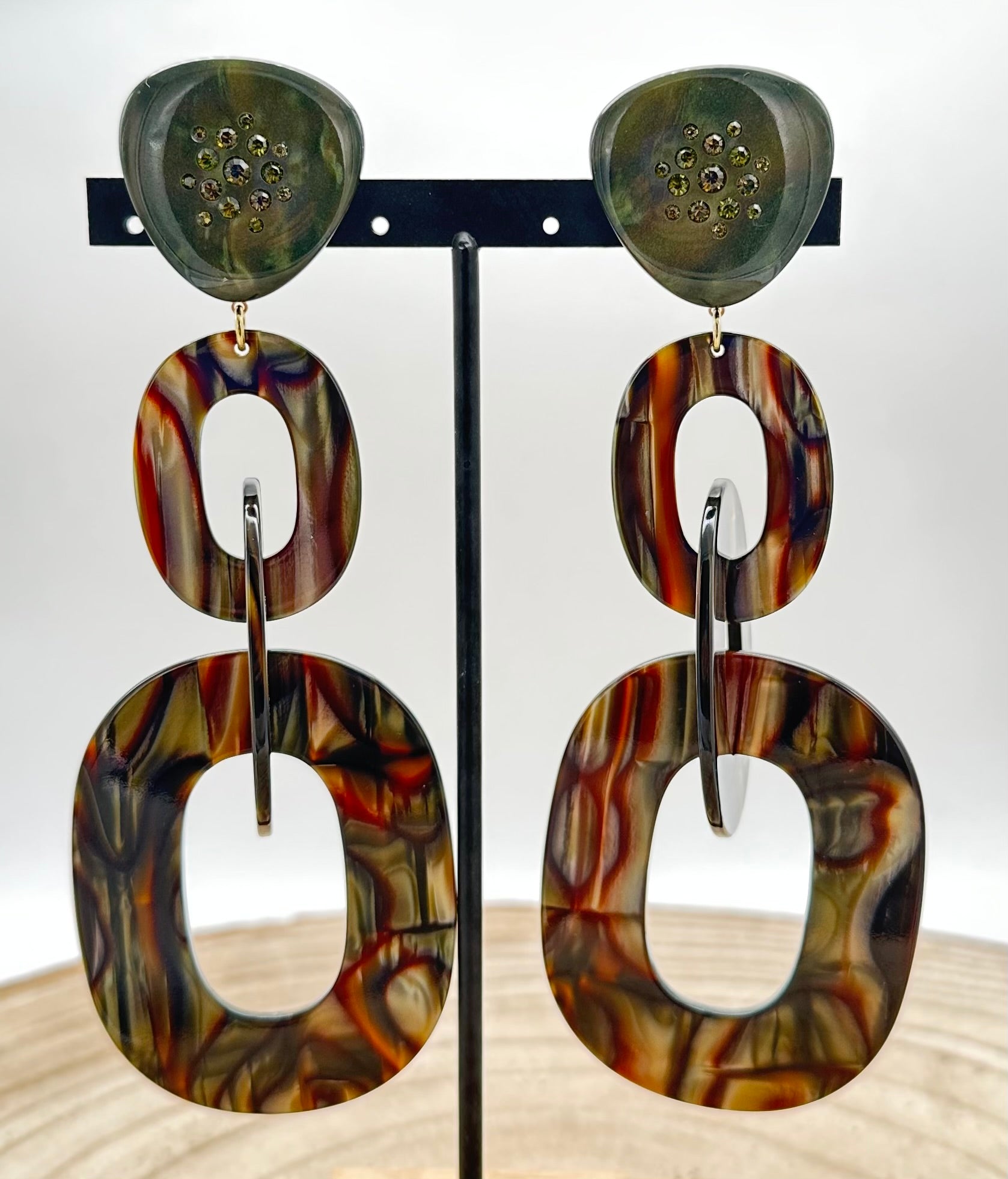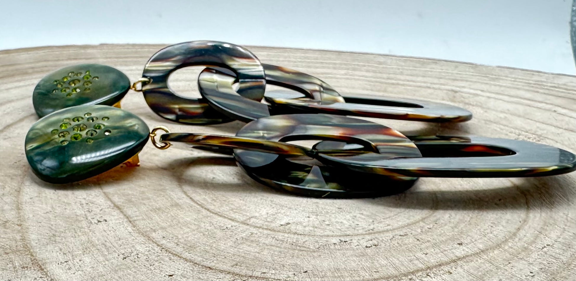 Boucles d’oreilles Onyx, en 3 éléments, un cabochon vert avec strass - Francine BRAMLI