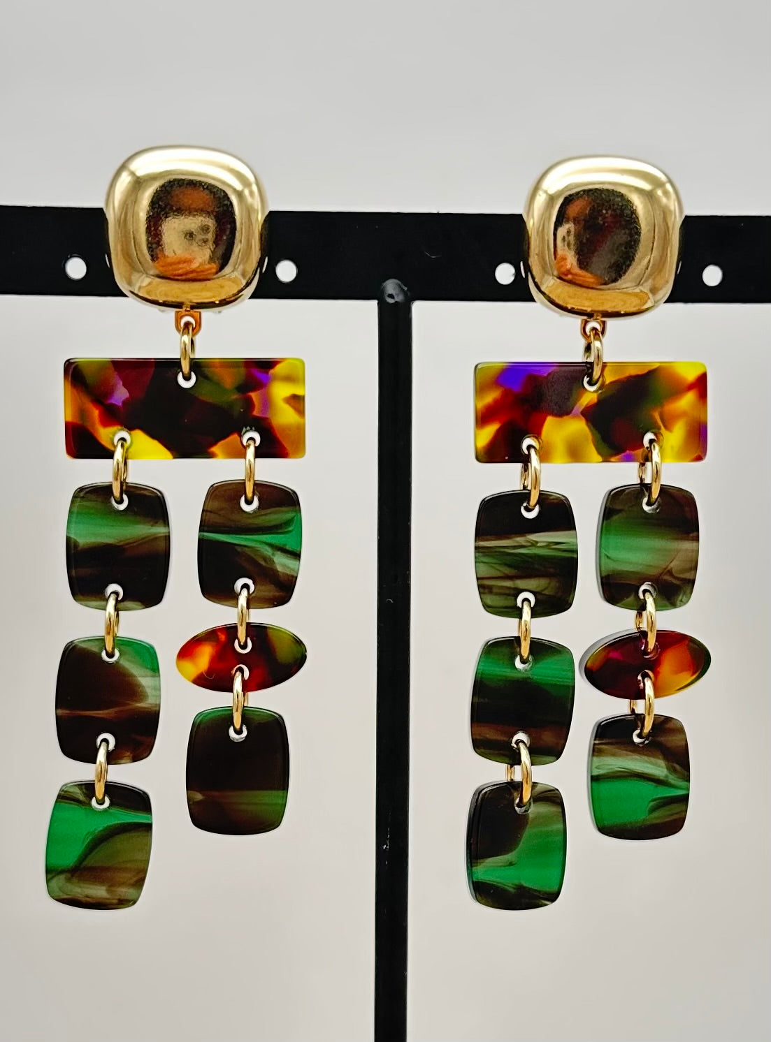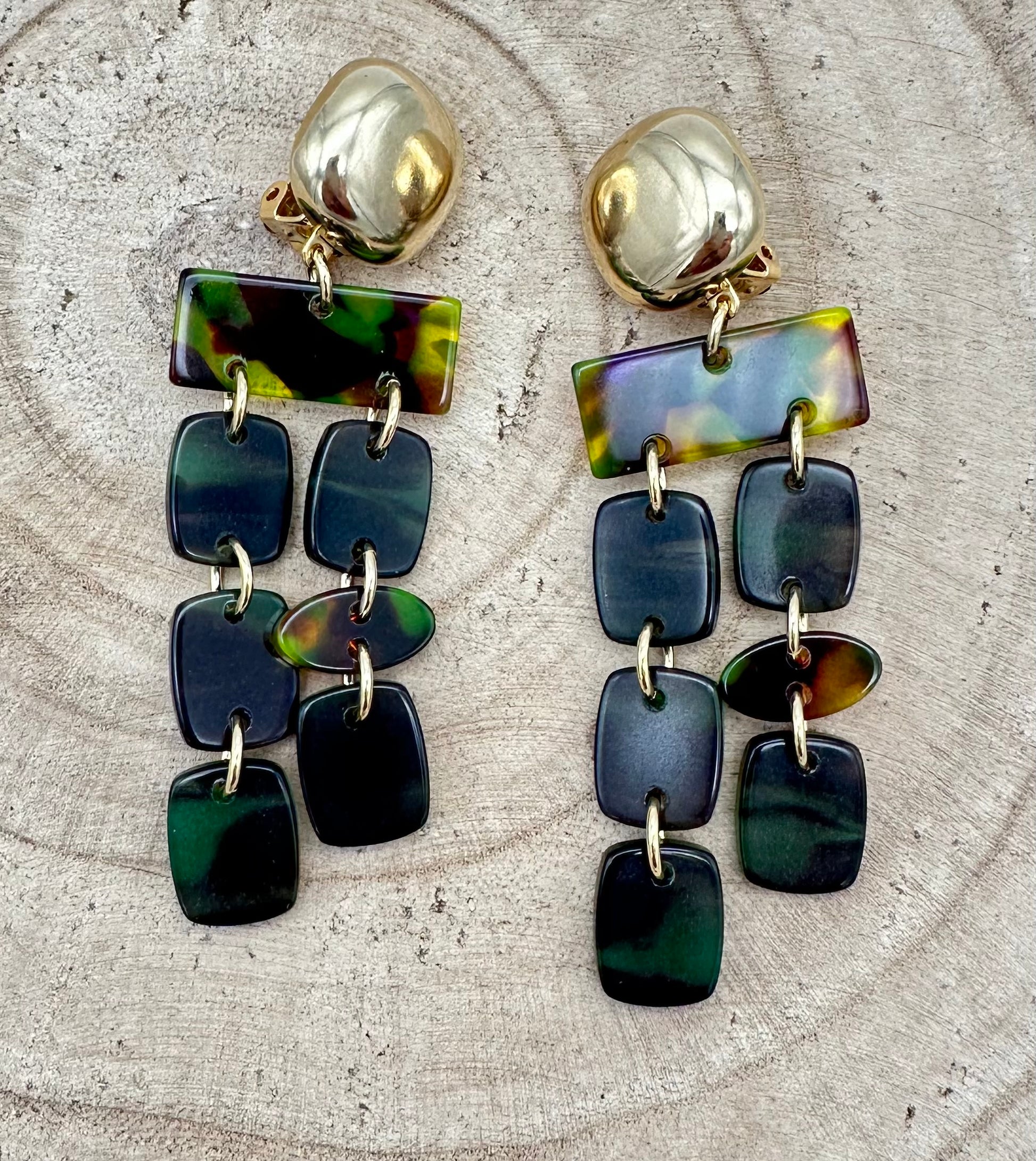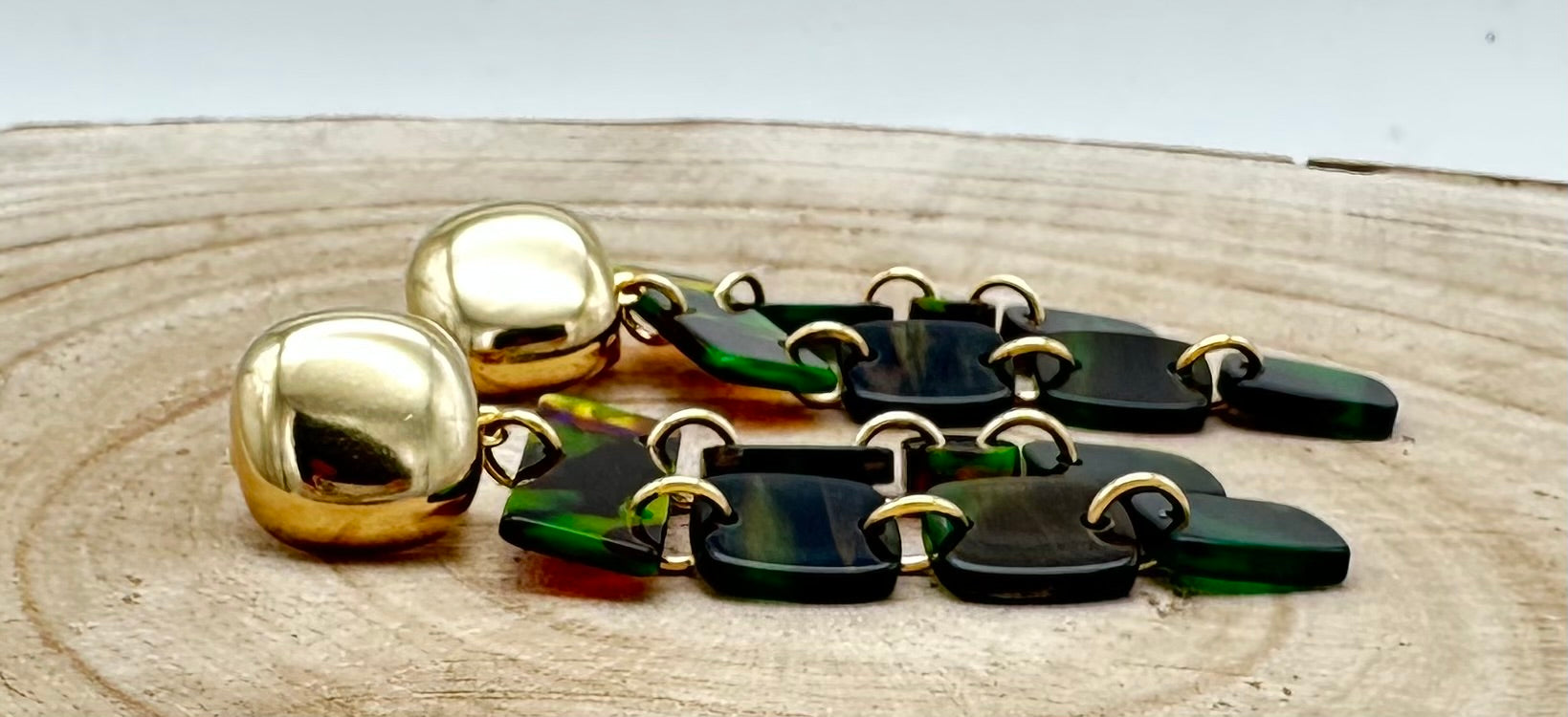 Boucle d’oreille PAMPILLES, cabochon dorée, reflets verts - Francine BRAMLI