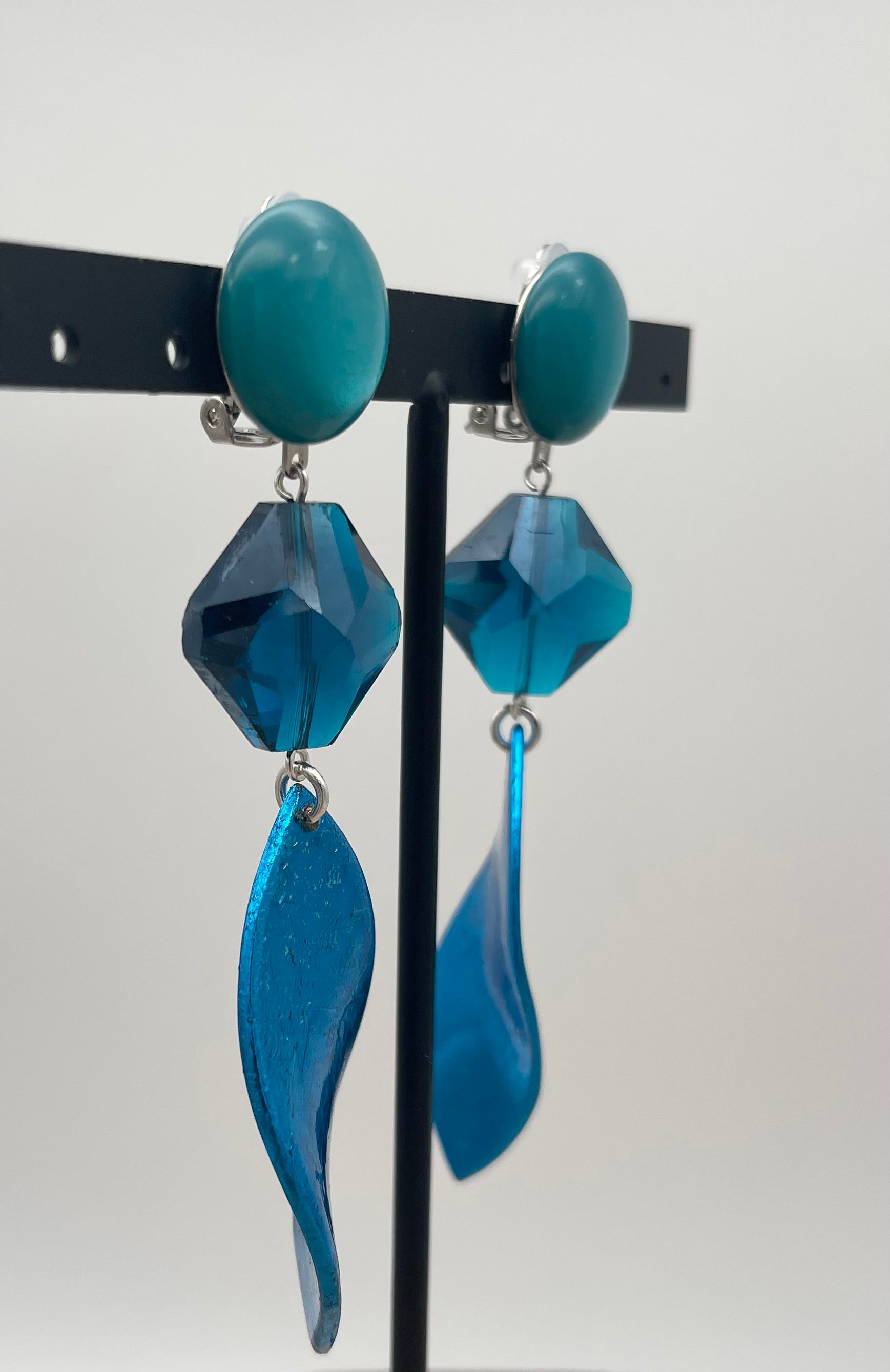 Boucles d’oreilles flammes bleues, éléments scintillants, feuille d’or teintée bleue, résine végétale - Francine BRAMLI