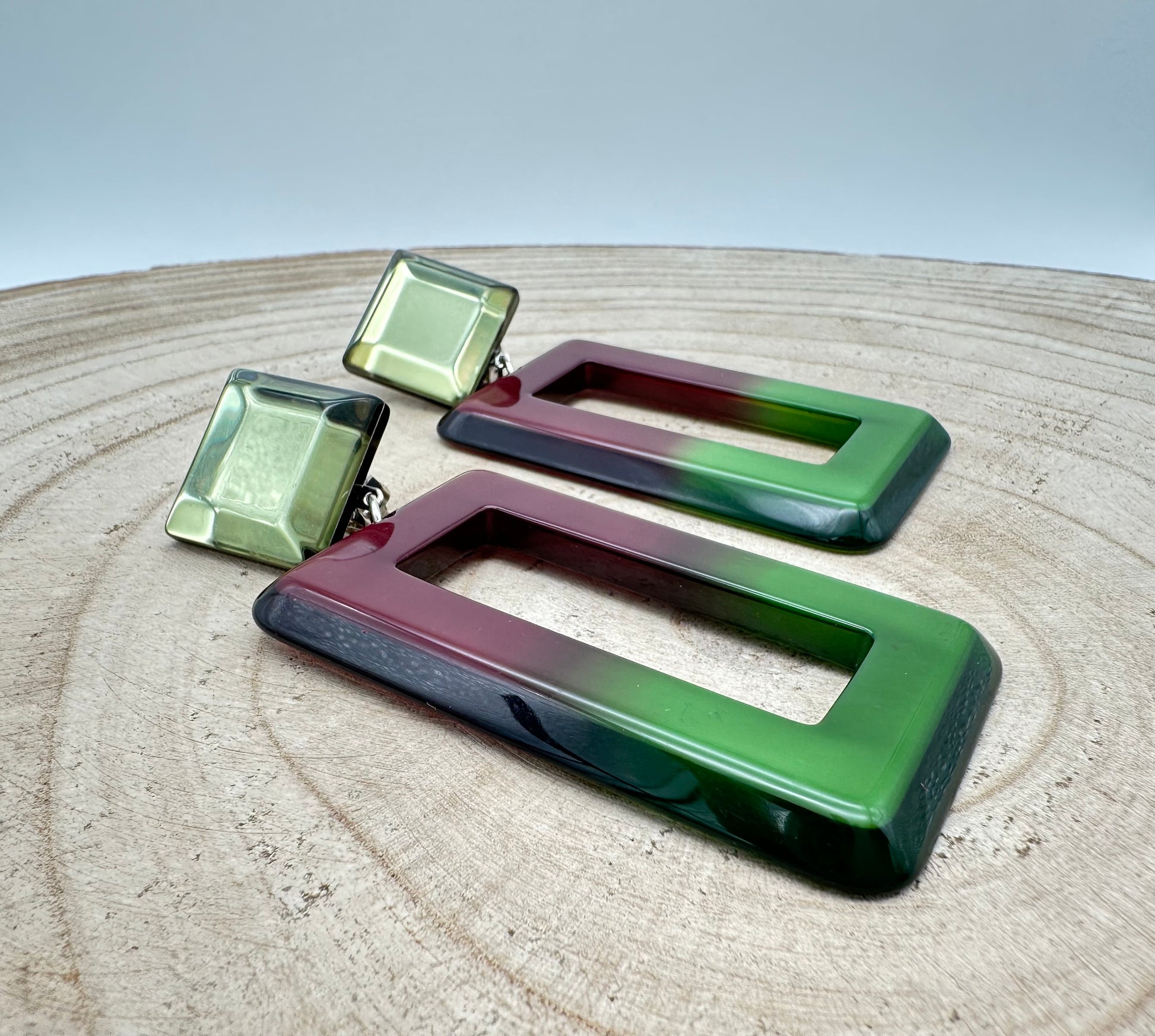 Boucles d’oreilles carrées dégradées pourpres/ prunes et vertes, cabochons miroirs, résine végétale - Francine BRAMLI