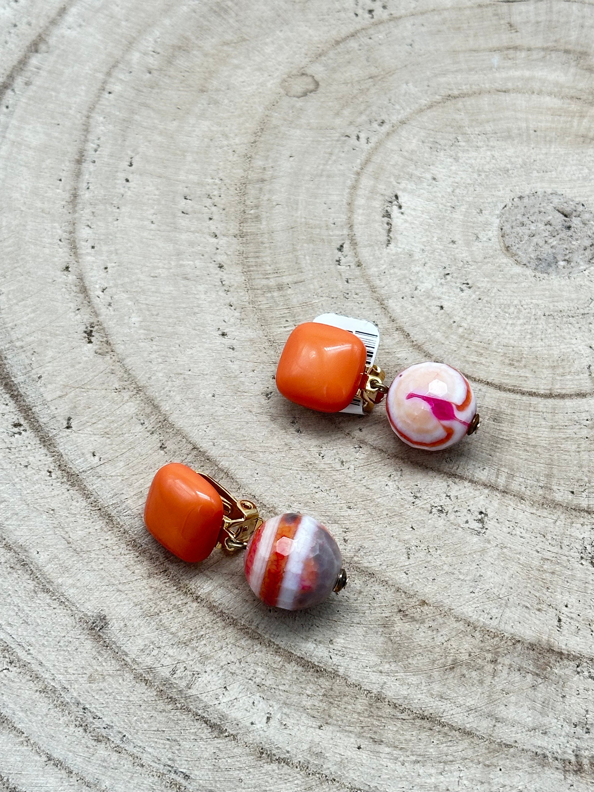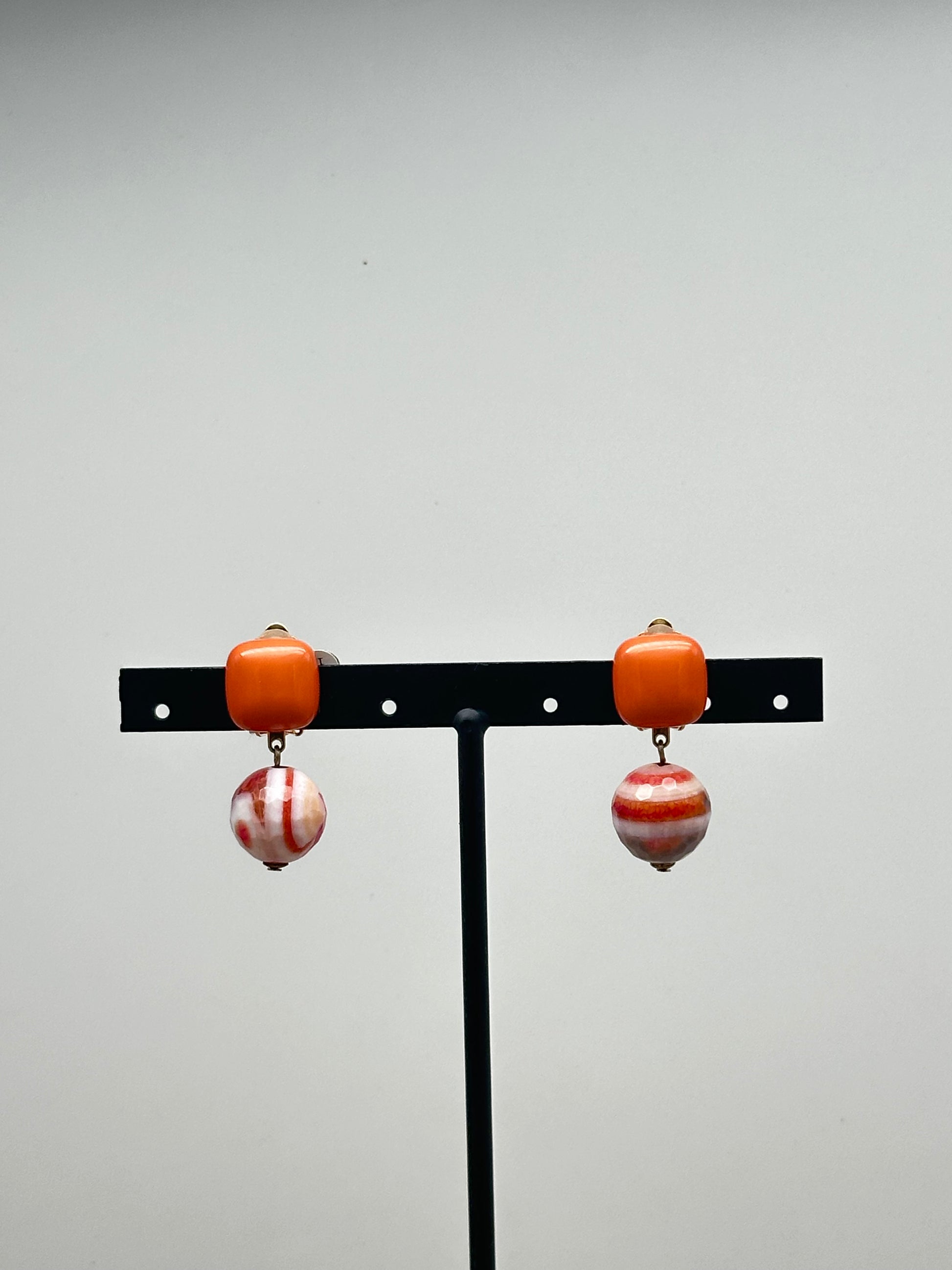 Boucles d’oreilles perles fantaisies rayées oranges et blanches, effet ruche brillant, résine végétale - Francine BRAMLI