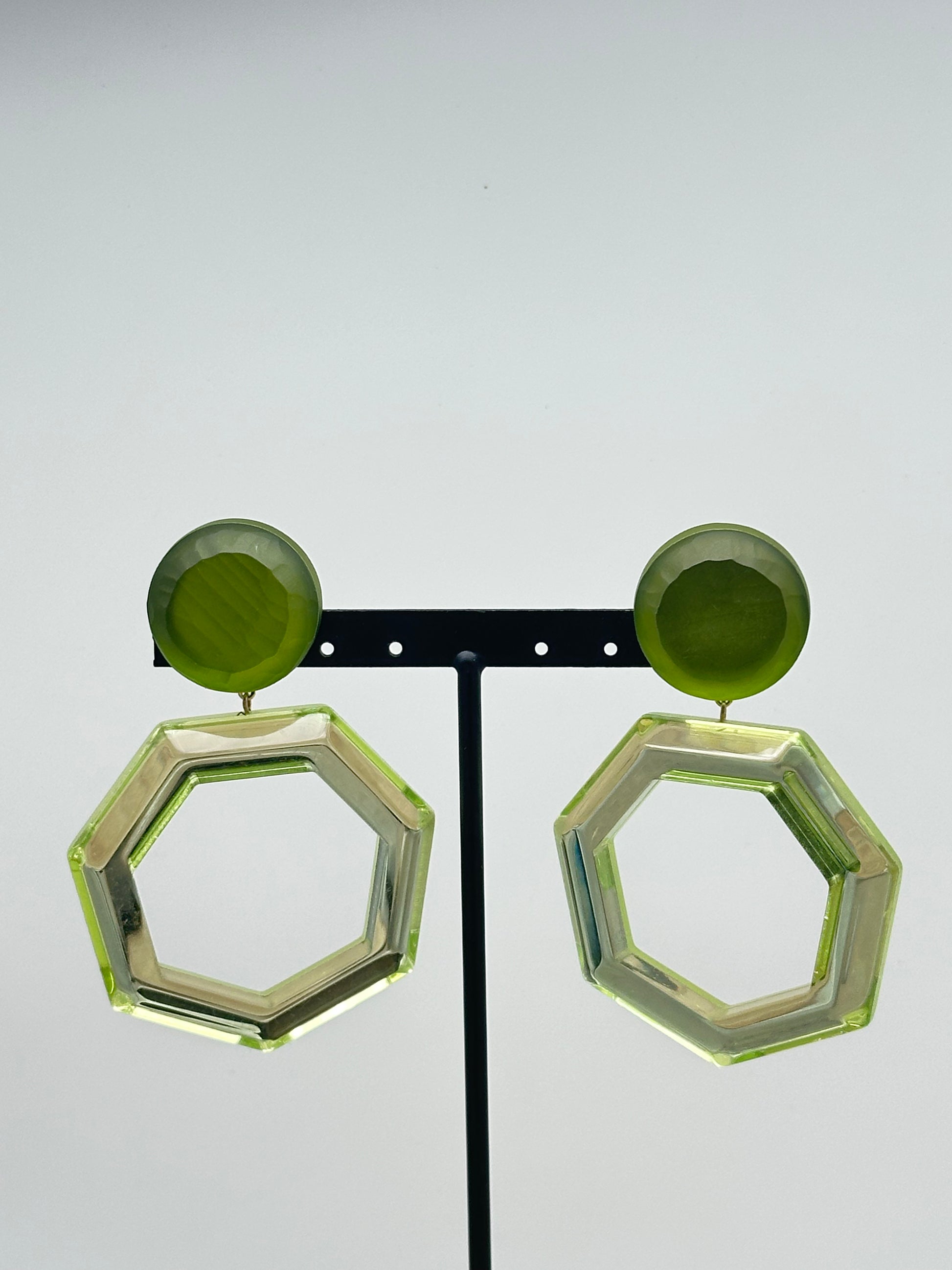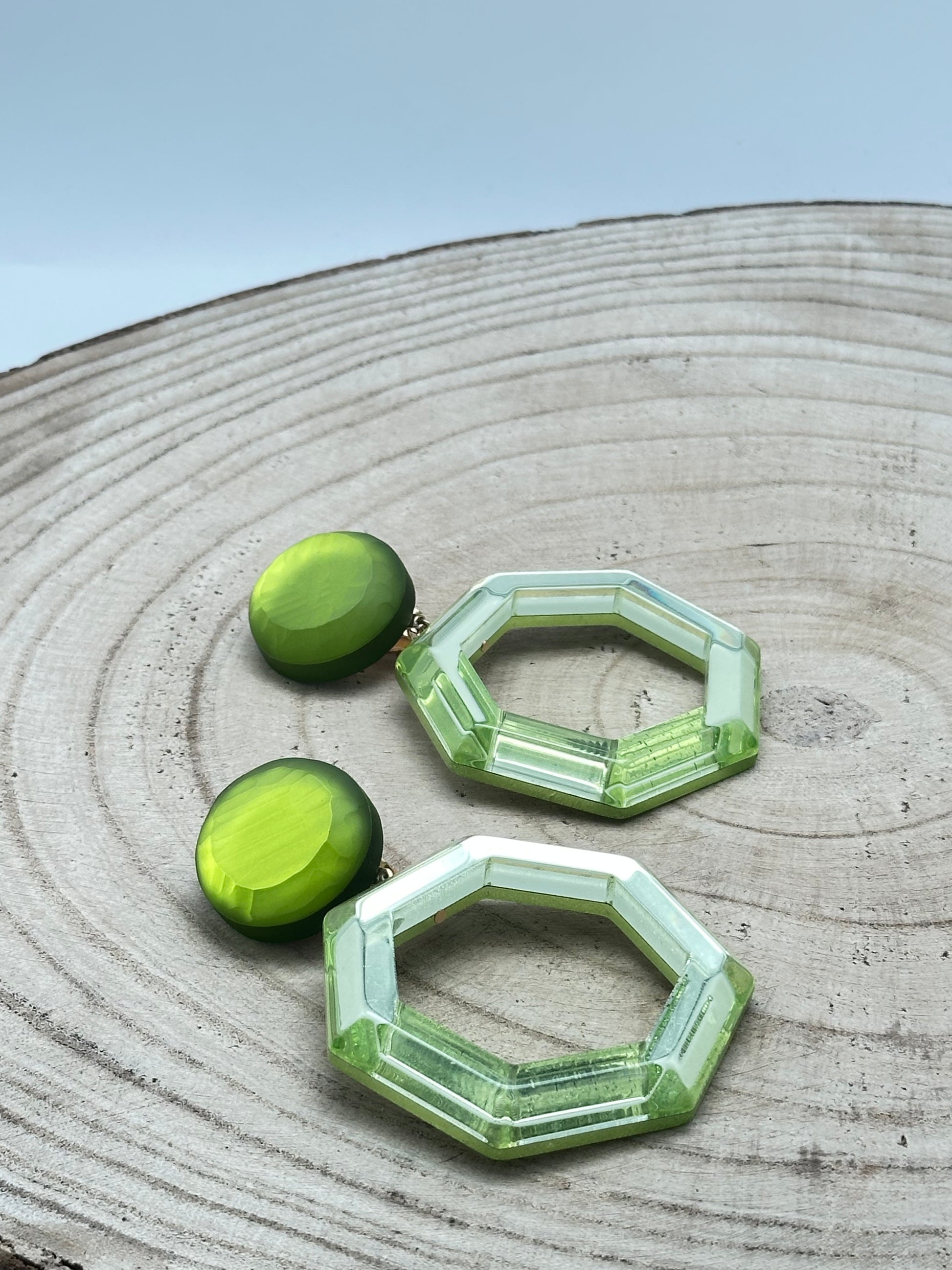 Boucles d’oreilles créoles hexagonales effets ruche miroir, résine végétale - Francine BRAMLI