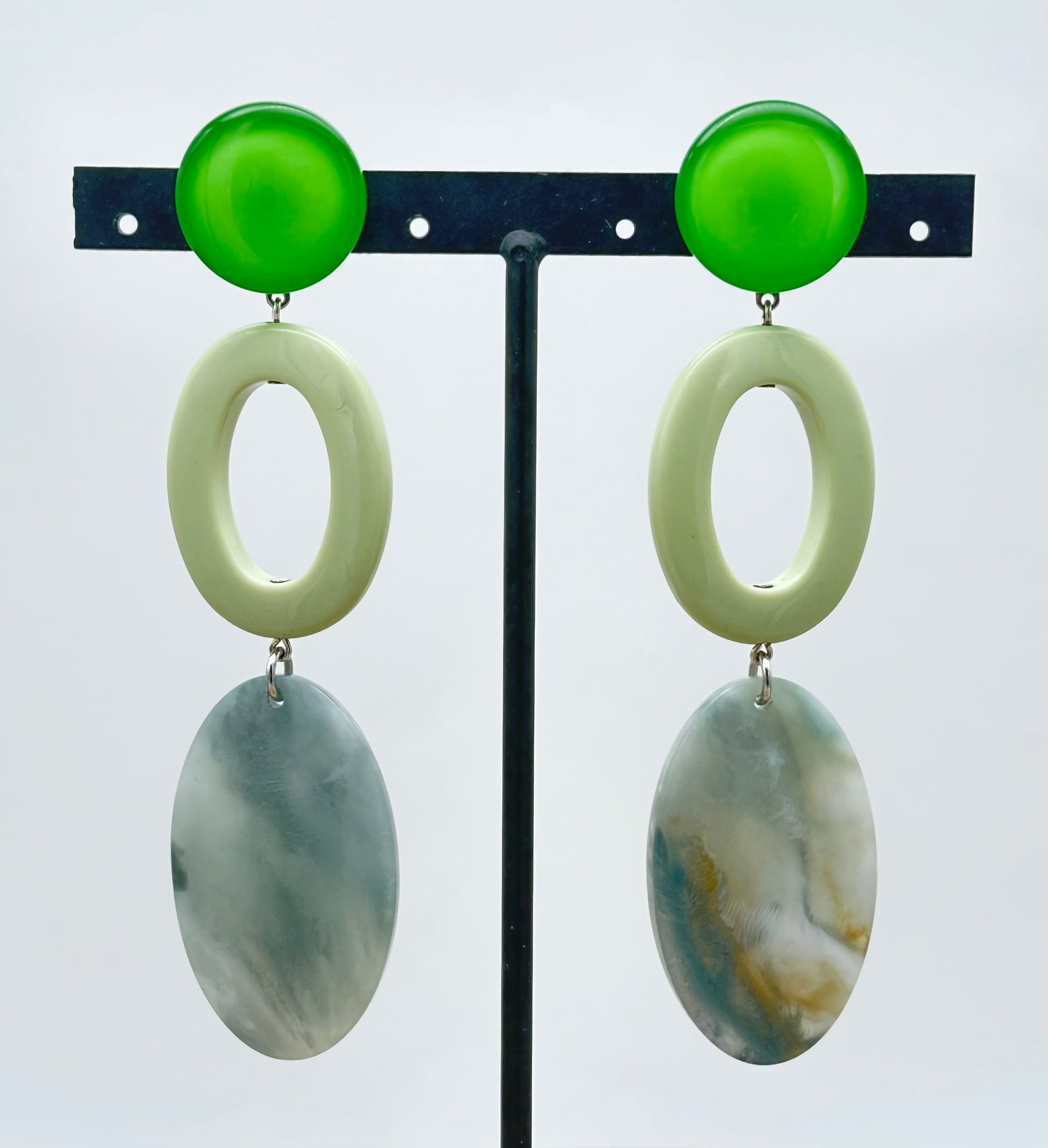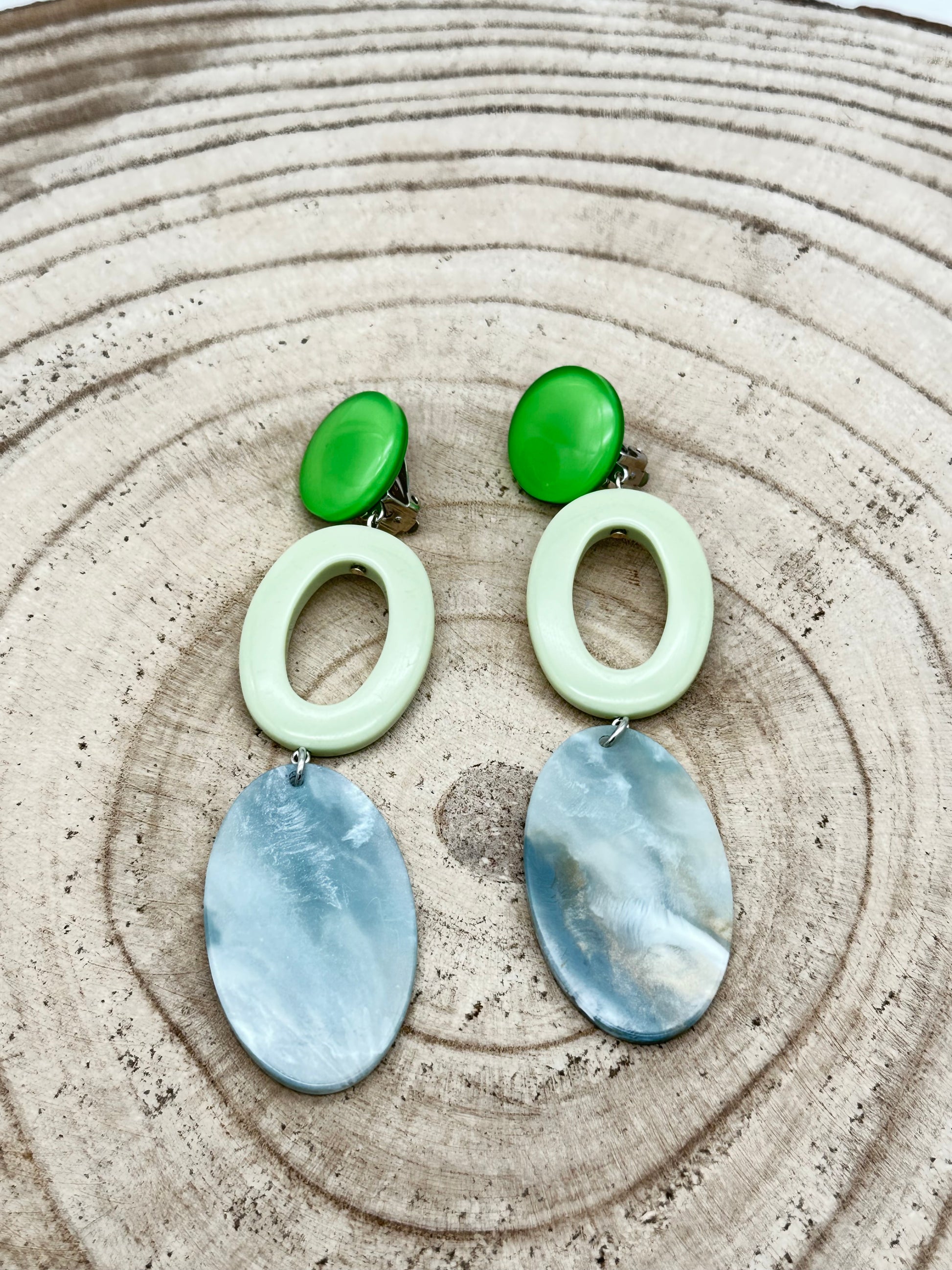 Boucles d’oreilles plaques et créoles vertes, plaques effet marbre, résine végétale - Francine BRAMLI