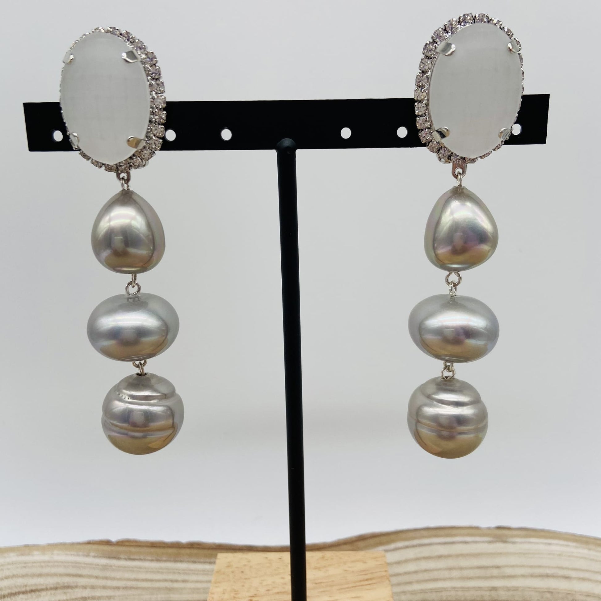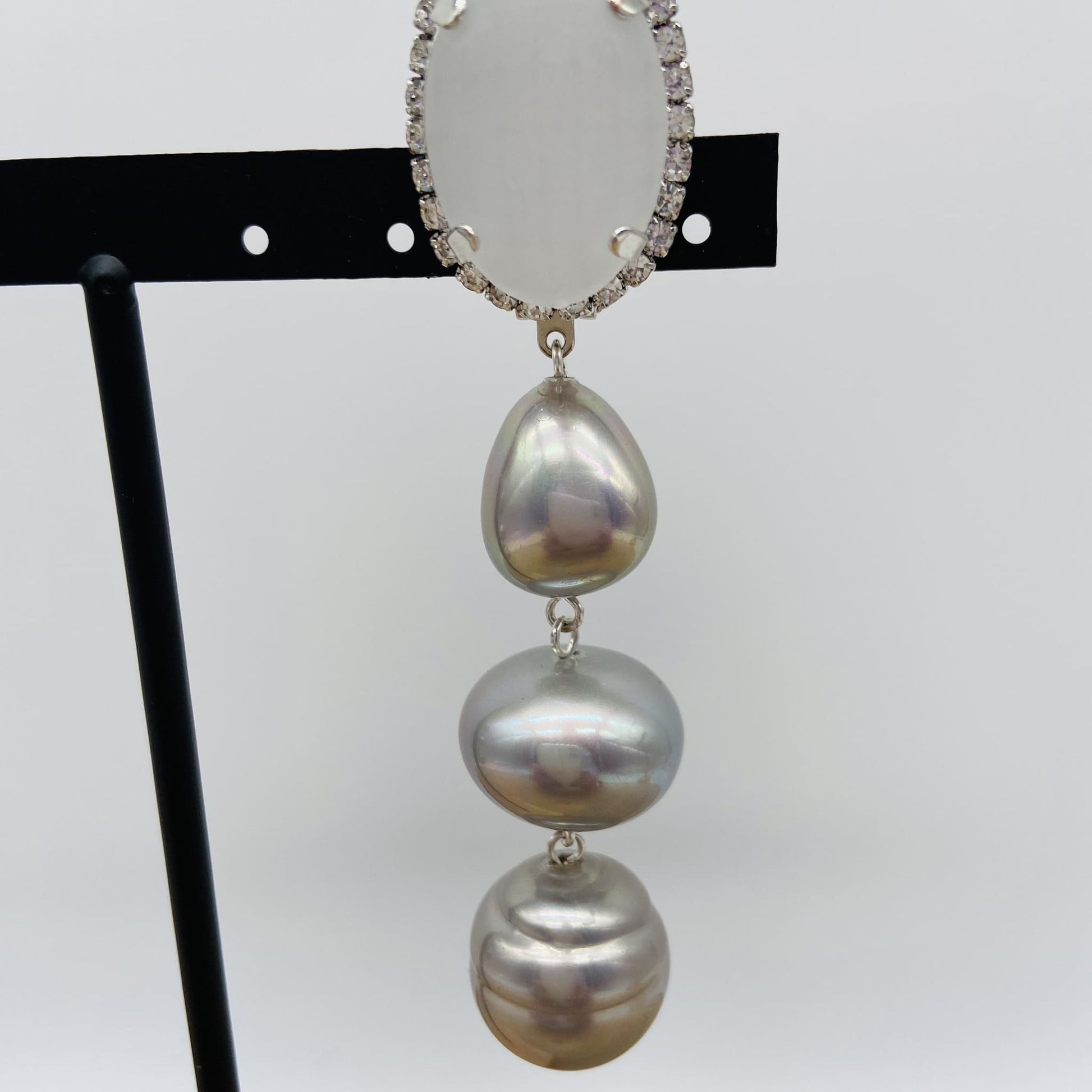 Cabochon argenté givré orné de strass, 3 boules argentées en guise de pendentif.