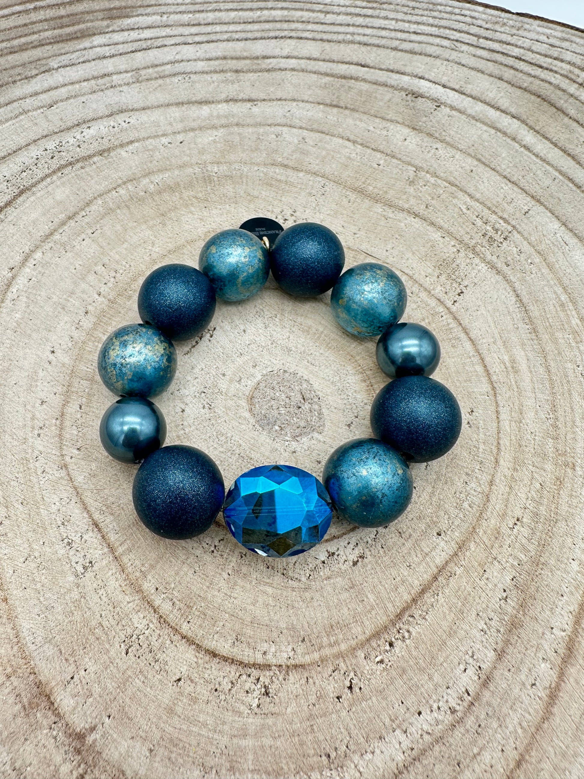 Bracelet élastique perles fantaisie et éléments scintillants, couleur bleu, résine végétale - Francine BRAMLI