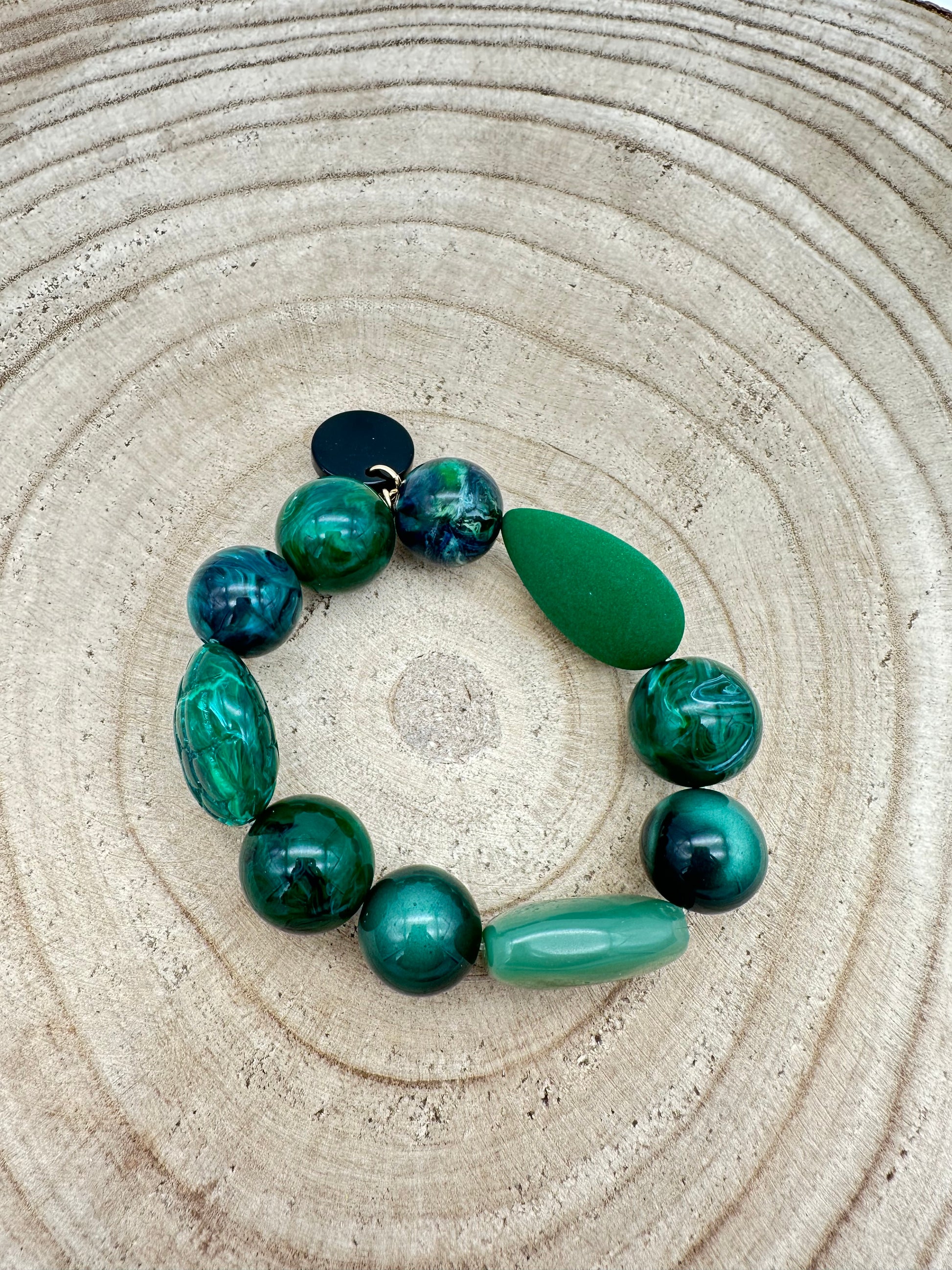 Bracelet élastique perles fantaisie, perle effet velours, couleur vert, résine végétale - Francine BRAMLI