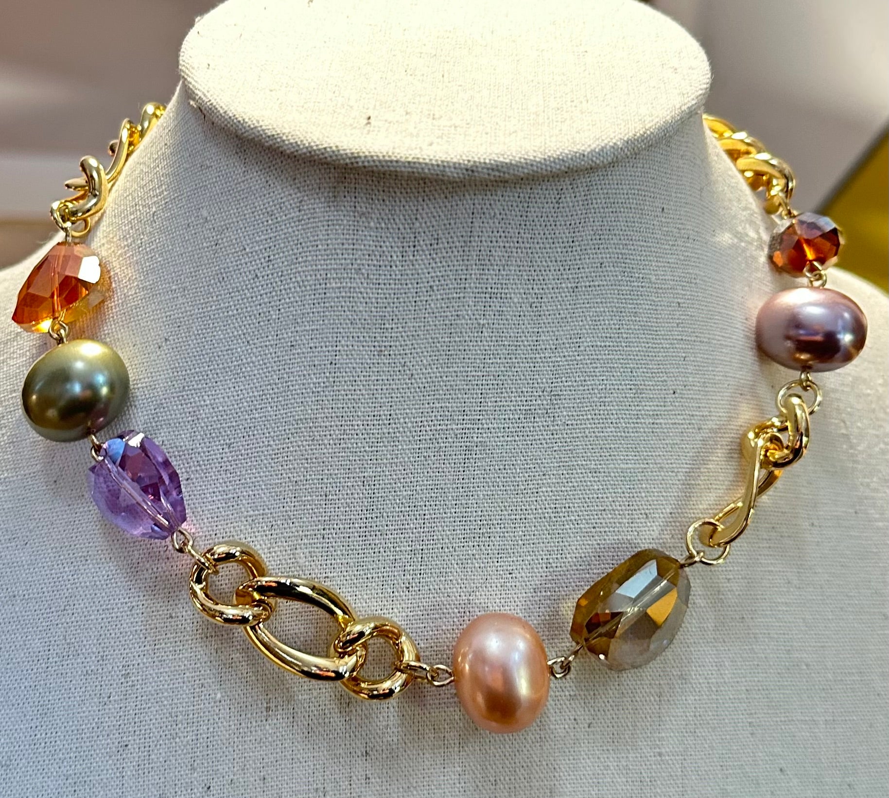 Collier Cristal / Perles, doré, violet, rose, vert - Francine BRAMLI