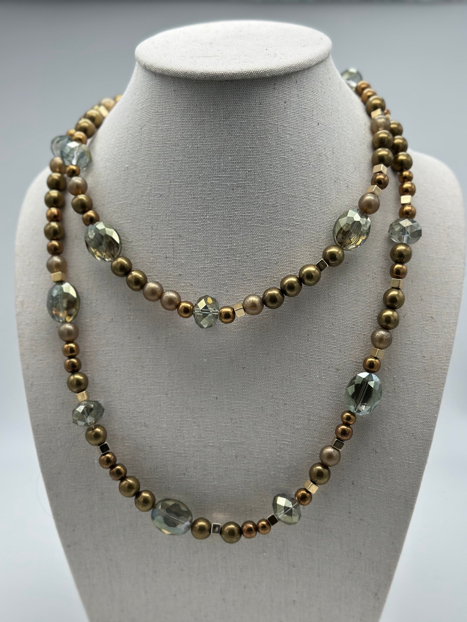 Collier / sautoir - Perles en résines olive dorées - elements scintillants vert olive - Francine Bramli