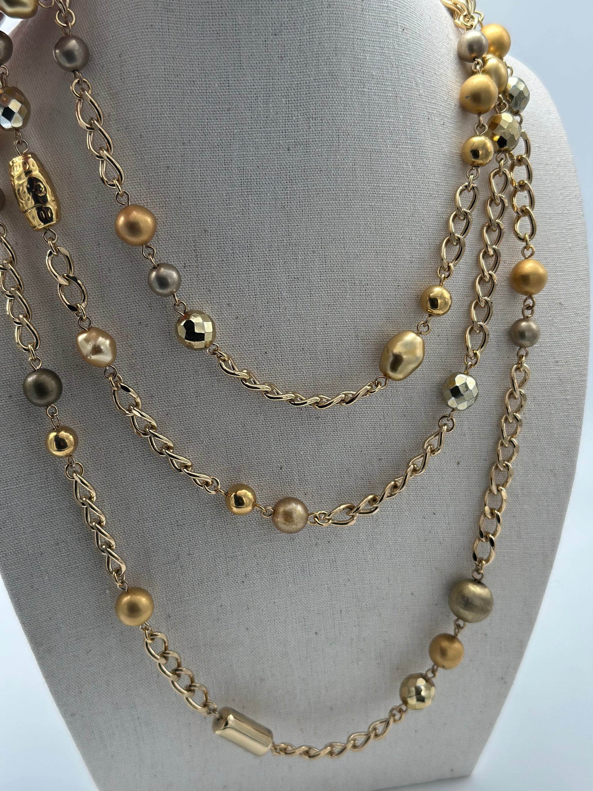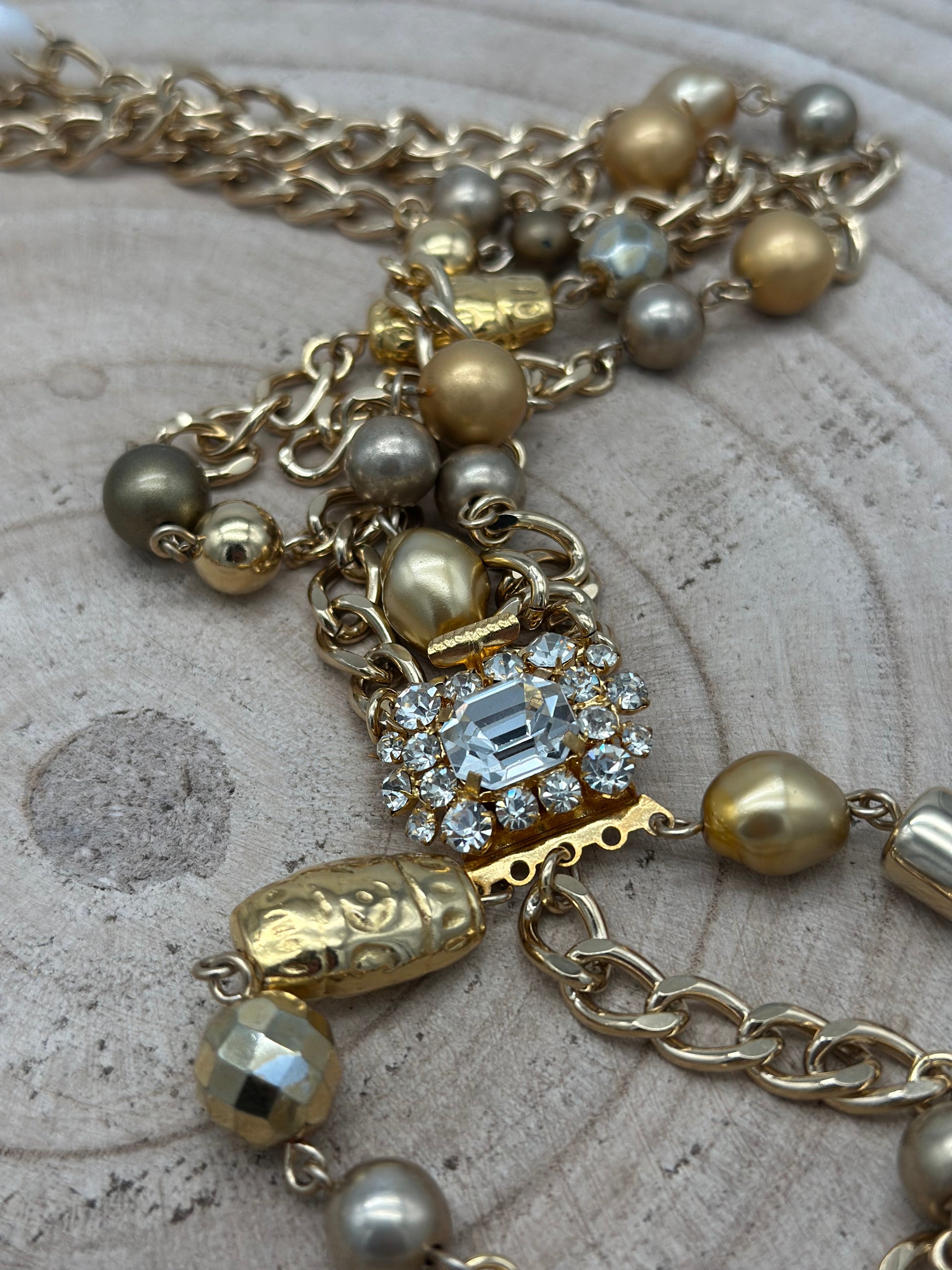 Collier / sautoir 3 rangs - éléments scintillants - perles fantaisies en résine doré - fermoir strass - Francine Bramli