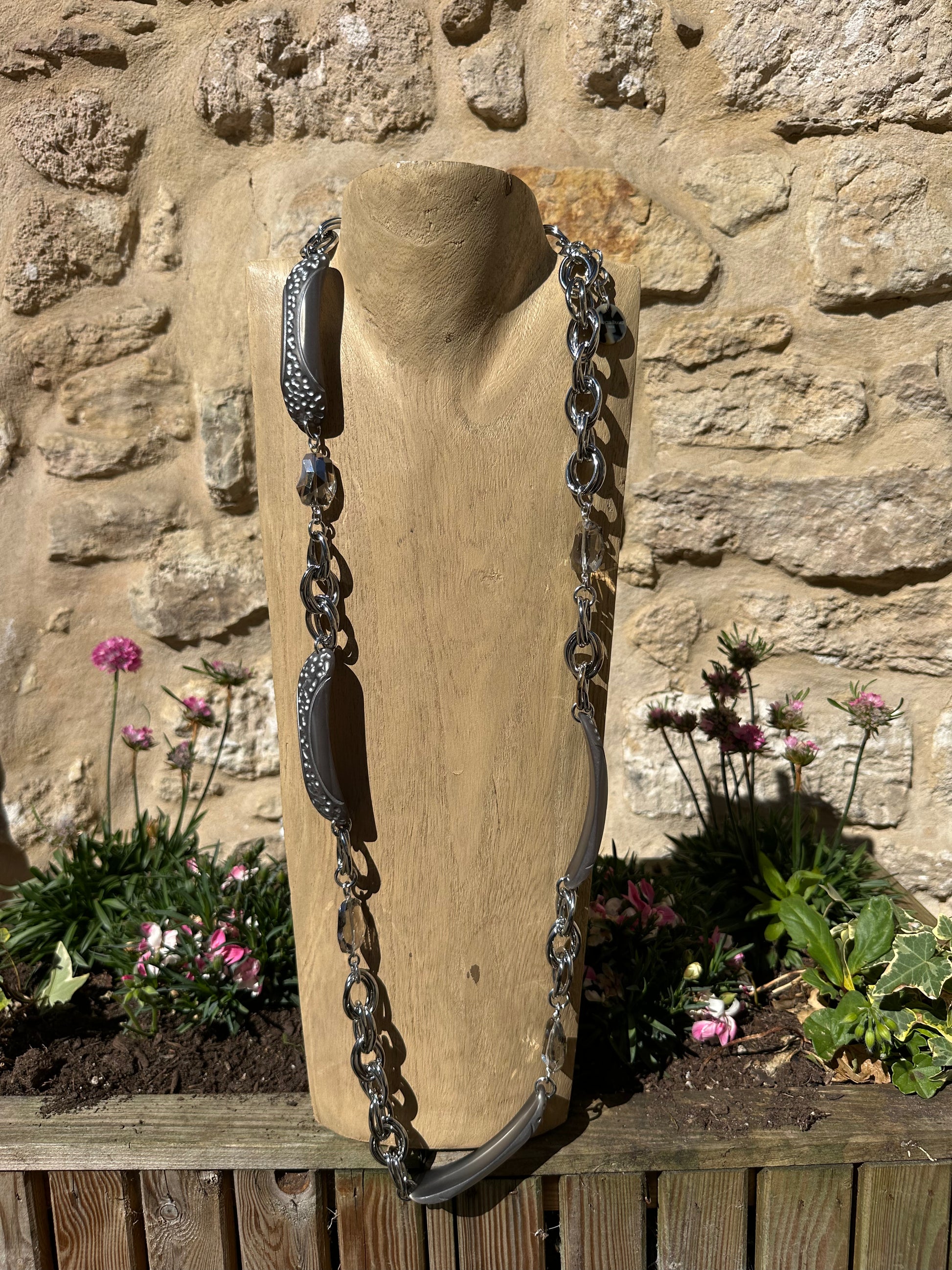 Sautoir éléments plaques couleur grises avec points gravés, chaine argentée, éléments scintillants - Francine BRAMLI